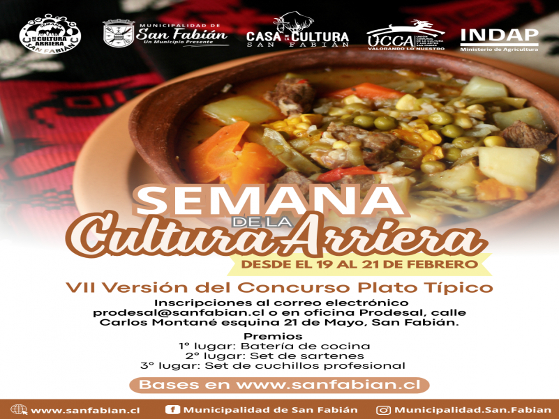 INSCRIPCIONES: Consultas sobre el séptimo concurso de Plato Típico, al correo electrónico prodesal@sanfabian.cl o en oficina Prodesal, calle Carlos Montané esquina 21 de Mayo, San Fabián.
