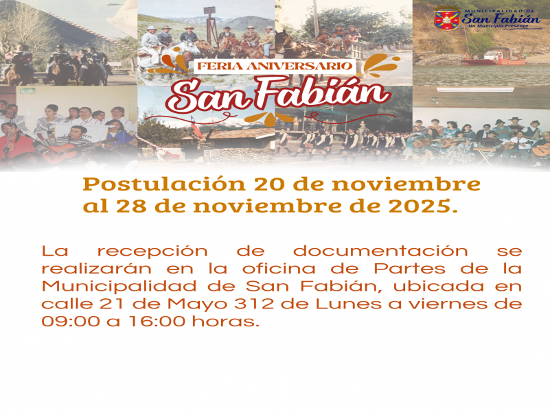 La I. Municipalidad de San Fabián a través de su Oficina de Fomento Productivo, extiende una cordial invitación a los productores, emprendedores y empresarios, a participar en la Feria Aniversario 2025, la cual se realizará en plaza de San Fabián.