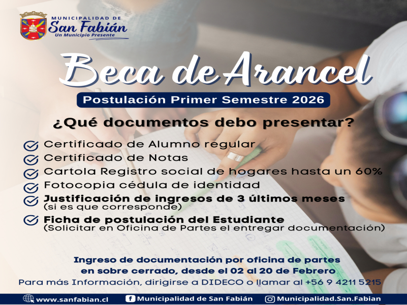 A continuación puedes conocer qué documentación necesitas para postular a tu beca primer semestre 2026, no olvides que debes entregar la documentación en un sobre cerrado desde el 02 al 20 de Febrero en la Oficina de Partes e Informaciones de la Municipalidad de San Fabián.